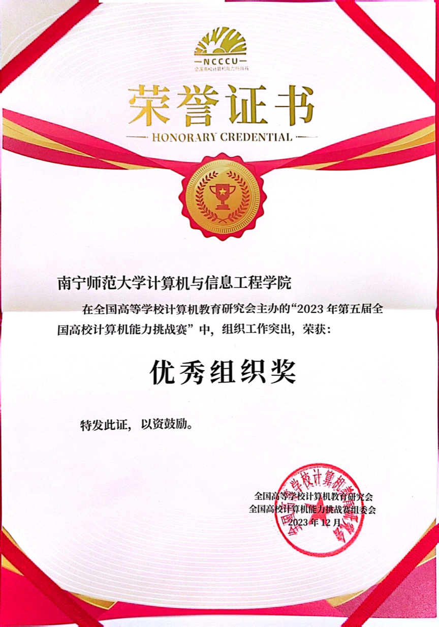 计算机与信息工程学院学子在全国总决赛中喜获二等奖6名、三等奖7名,在广西区域赛中获一等奖3名,二等奖15名,三等奖38名的好成绩。因组织工作突出,计算机与信息工程学院被大赛组委会授予“优秀组织单位”。