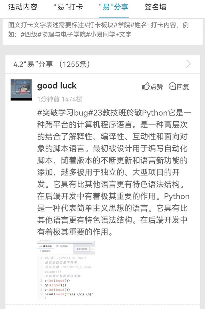 在为期两周的活动期间,同学们踊跃参与,每日坚持打卡,记录自己的学习进展和成就。大家在打卡过程中仔细梳理学习中遇到的各种“bug”,充分利用各种资源,深入学习计算机知识,有效提高了自主学习与解决问题的能力。同学们积极互动交流,分享学习经验与感悟,共同探讨解决“bug”的方法。大家纷纷表示,通过此次打卡活动,深刻理解到持之以恒和自律的重要性,提高了学习兴趣。同时,他们更加深入学习了计算机知识。