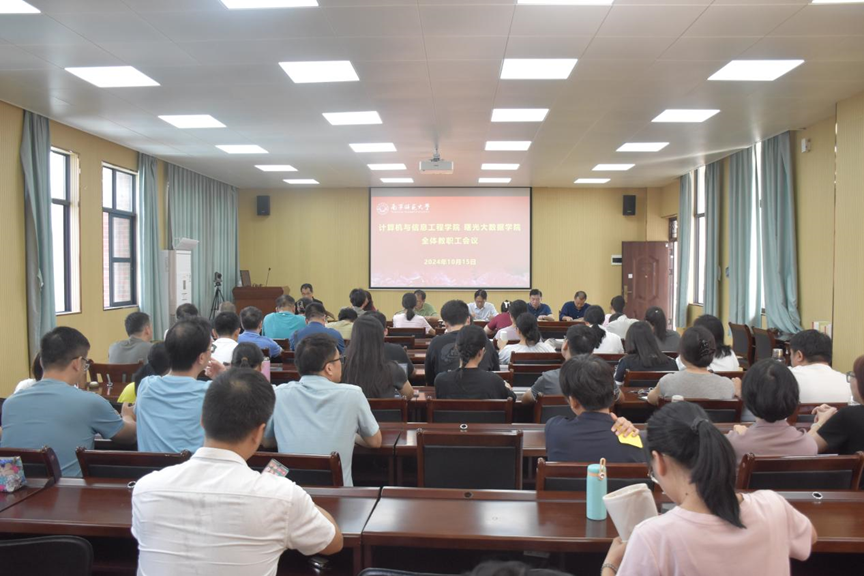 10月15日计算机与信息工程学院/曙光大数据学院在地信楼A301教室召开全体教职工会议,学院领导和全体教职工参加。会议由学院党委书记余朝文主持。
