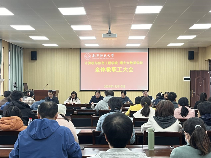 12月10日计算机与信息工程学院/曙光大数据学院在地信楼A301教室召开全体教职工会议,学院领导和全体教职工参加。会议由学院党委书记余朝文主持。
