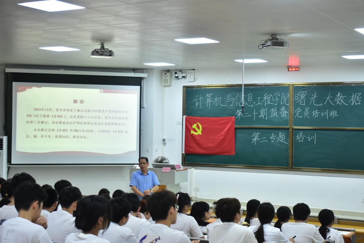 为进一步做好学院预备党员的培养和教育工作,5月9日,计算机与信息工程学院/曙光大数据学院在武2-121开展了第二十期预备党员培训班第二专题培训。本次培训的主题为“从严治党葆生机,坚守责任勇担当”,由学院党委书记余朝文担任主讲。