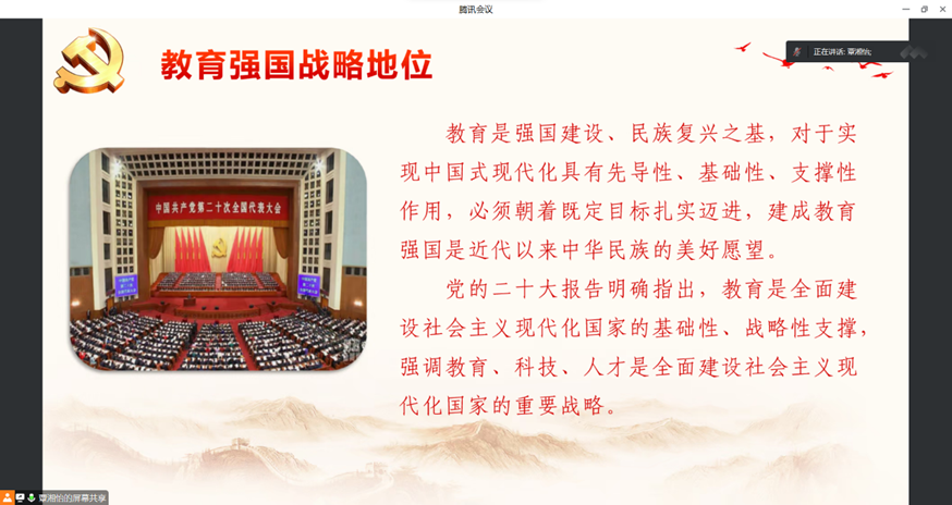 课上,计算机专升本第二党支部宣传委员覃湘怡同志带领支部成员围绕教育强国的内涵、教育强国的战略地位等内容阐述习近平总书记在全国教育大会上的重要讲话精神,她表示,我们要建成的教育强国,是中国特色社会主义教育强国,是具有强大的思政引领力、人才竞争力、科技支撑力、民生保障力、社会协同力、国际影响力,是为民族复兴伟业提供有力支撑的强国。