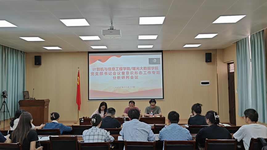 11月12日,计算机与信息工程学院/曙光大数据学院在地信楼A301召开党支部书记会议暨意识形态工作专题分析研判会议,会议采用线上线下同步进行。参加会议的有学院党委书记余朝文、副书记韦柳温、辅导员史朝有以及各党支部书记。会议由余朝文书记主持。