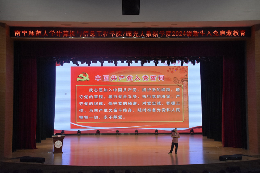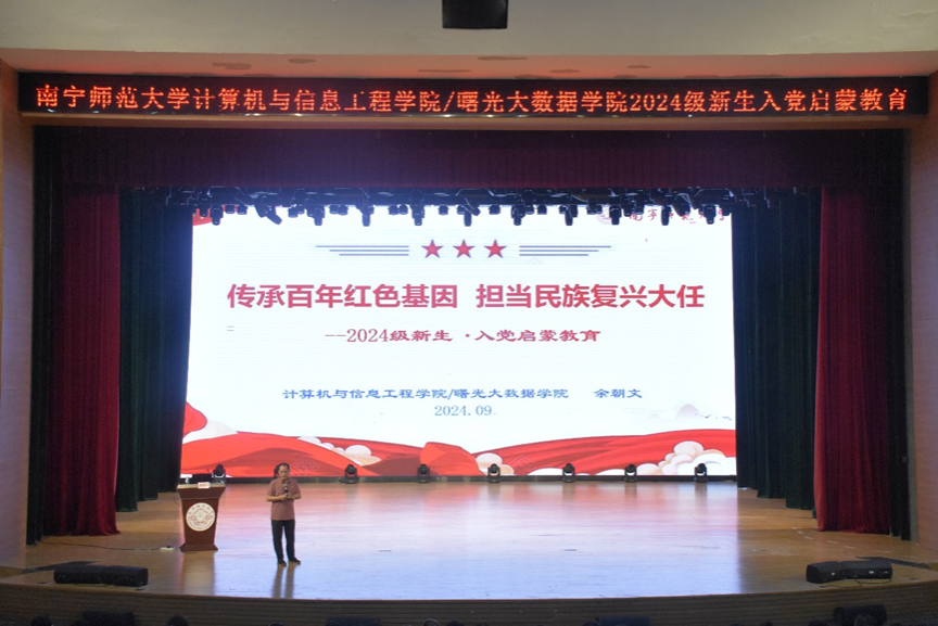 9月20日,计算机与信息工程学院/曙光大数据学院在武鸣1号报告厅举办了以“传承百年红色基因 担当民族复兴大任”为主题新生入党启蒙教育。讲座由学院党委书记余朝文主讲,辅导员林雪、史朝有、黄海泳老师和学院570多名新生参加活动。