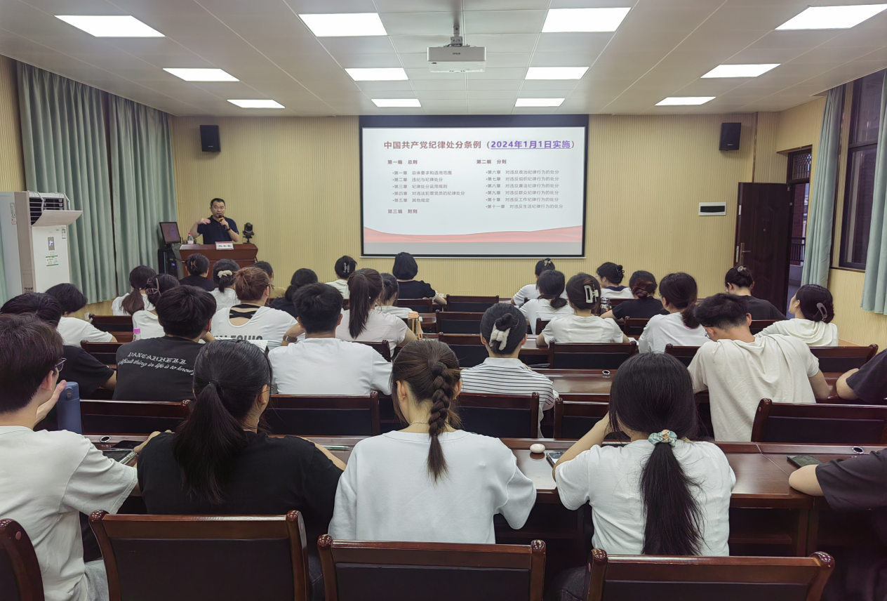 课上,学院党委书记余朝文同志为师生党员深入解读党的纪律要求,并结合大学生的特点和典型案例,引导党员干部自觉遵守党的纪律,自觉维护党的形象和荣誉;学院副书记、院长闭应洲同志以“知敬畏、守规矩,促进学院高质量发展”为题,强调师生党员同志应恪守纪律,时刻铭记党员应有的责任与担当,坚持用党规党纪校正思想和行动;学院党委副书记韦柳温同志带领学生党员回顾了《条例》的修订历程,重点讲解了关于不予处分、不追究党纪责任、党员拒绝作证或故意提供虚假情况等十五条重点条文的具体规定,使党员对党的纪律要求有了更加清晰的认识;学院副院长欧启忠同志对“六大纪律”的重要条款进行了逐一解读各项纪律的具体内容和要求,并结合实际案例对条例中的相关条款进行解读,要求大家必须时刻保持清醒的头脑和高度的警觉性,严格遵守党的纪律和规矩;学院副院长陆建波同志提醒学生党员同志们要遵守党纪,坚守底线不越红线,做合格党员,筑牢拒腐防变的防线,扣好人生的“第一粒扣子”,争做新时代清正廉洁好青年;学院副院长熊冬春同志结合实际案例着重论证了严守党的政治纪律就是要时刻保持政治清醒,给与会党员同志讲授严守政治纪律规矩以及争做“三个表率”的经验做法。