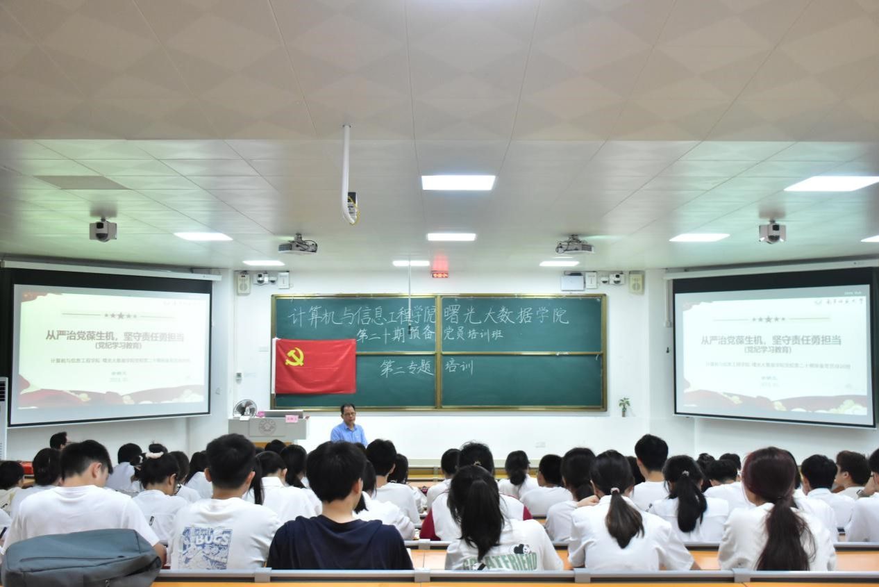 为进一步做好学院预备党员的培养和教育工作,5月9日,计算机与信息工程学院/曙光大数据学院在武2-121开展了第二十期预备党员培训班第二专题培训。本次培训的主题为“从严治党葆生机,坚守责任勇担当”,由学院党委书记余朝文担任主讲。