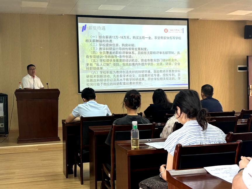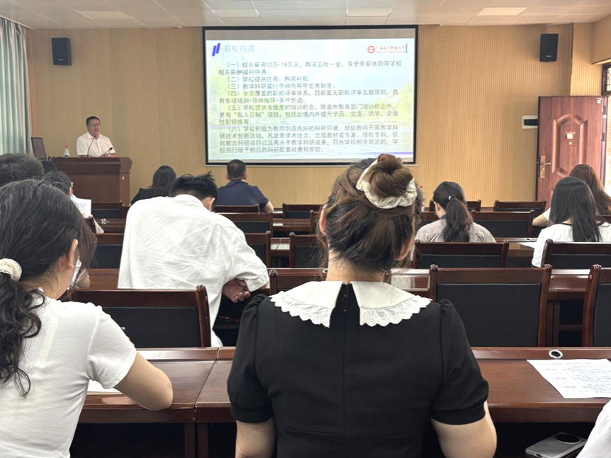 宣讲会上,广西城市职业大学人工智能与大数据学院院长蒙振海从学校的办学理念、发展历程、校园文化特色等方面进行了详细介绍,并重点强调了学校对高层次技术技能型人才的渴求。同时,还介绍了学校优厚的薪酬福利体系,包括有竞争力的薪资待遇、完善的晋升机制、丰富的培训机会以及舒适的办公环境等,让同学们切实感受到学校对人才的高度重视与悉心呵护。