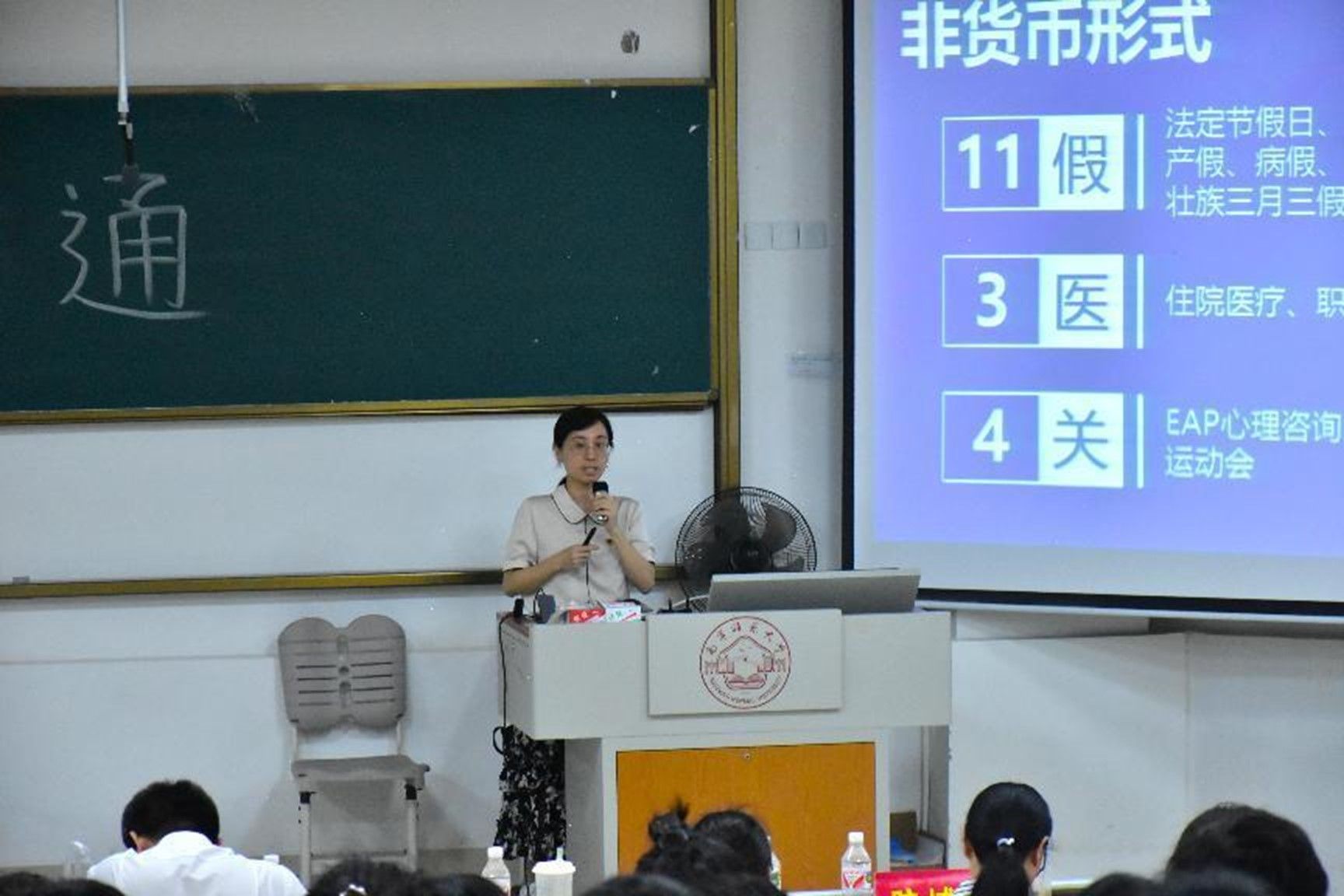 4月17日,计算机与信息工程学院/曙光大数据学院邀请中国联通在武鸣校区1号教学楼115教室举行2024届校园专场招聘宣讲会,招聘宣讲会由中国联通公司的人力经理陈翠担任主讲人,学院辅导员林雪及计信学院、物电学院、物管学院等100多名2024届毕业生参会。
