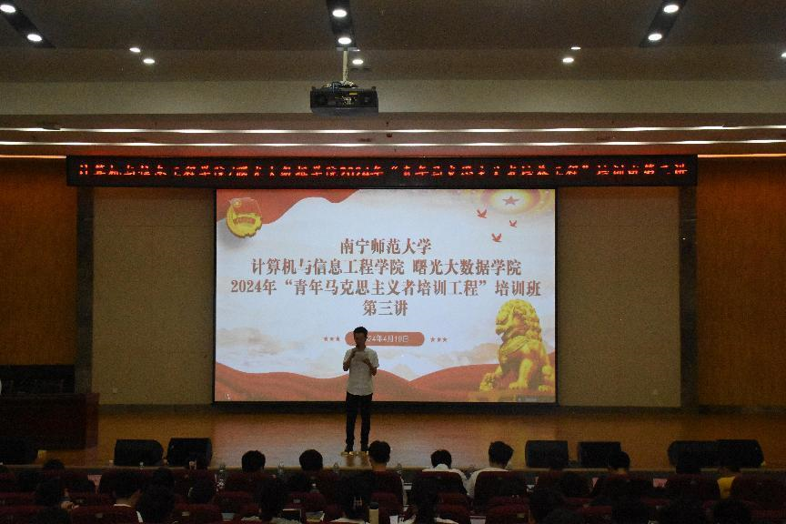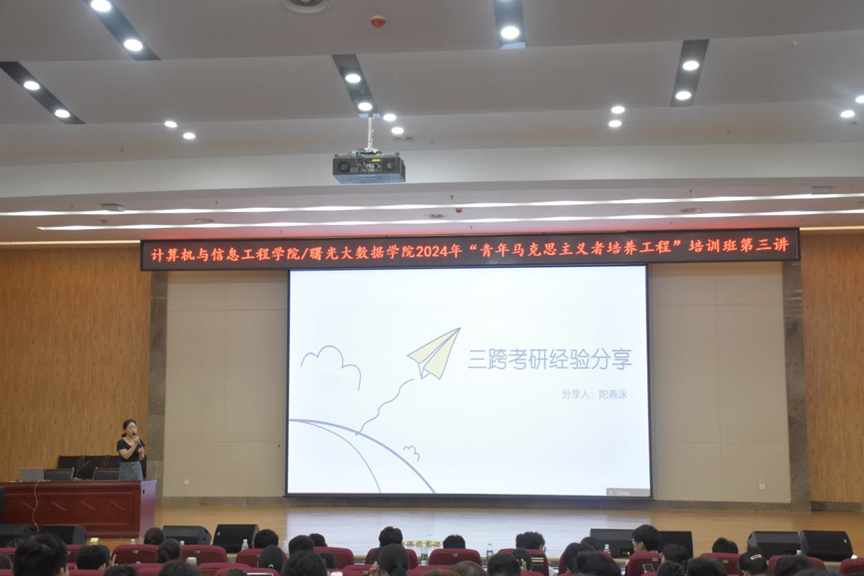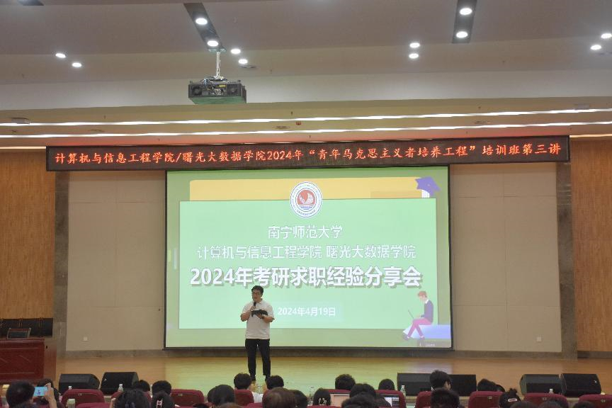 计算机与信息工程学院/曙光大数据学院4月19日在图书馆报告厅举行“青年马克思主义者培养工程”(以下简称“青马班”)培训班第三讲——2024年考研求职经验分享会。此次会议邀请了多位优秀学长学姐作为嘉宾分享经验,学院兼职辅导员石凯、团委学生会主席团、我院“青马班”全体学员以及三百多位同学参加。