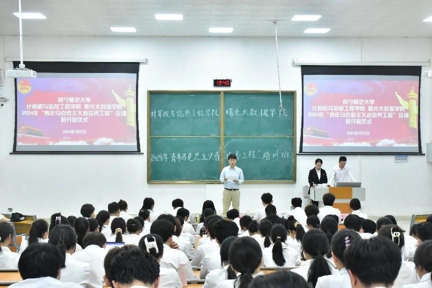 为深入学习和贯彻习近平新时代中国特色社会主义思想,坚定青年一代听党话、跟党走的信念。计算机与信息工程学院/曙光大数据学院于4月1日在地化楼B111教室举行“青年马克思主义者培养工程”(以下简称“青马班”)培训班开班仪式暨第一讲。此次培训由辅导员宋宏斌老师主讲,辅导员许艺静老师和我院“青马班”全体学员参加。