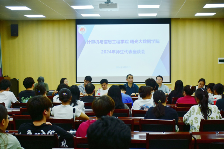 为了深入调研学院课堂教学情况,全面了解学生的意见和需求,畅通师生沟通渠道和建立反馈机制,推动教风学风建设。计算机与信息工程学院/曙光大数据学院于3月25日在地信楼A301召开了2023-2024学年第二学期初师生代表座谈会。分管本科教学工作的熊冬春副院长、教育技术学系主任吴兰岸博士、23数据2班班主任李林博士、辅导员宋宏斌、林雪、史朝有、许艺静以及43名学生代表参加。