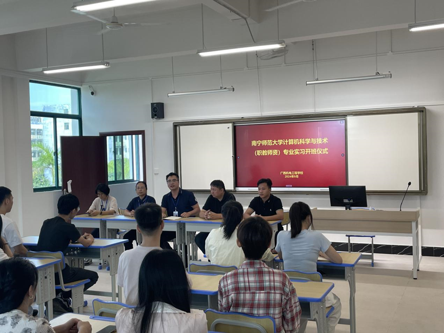 近日,经过前期准备,计算机与信息工程学院/曙光大数据学院37位计算机科学与技术专业同学由李行老师带队到广西机电工程学校开展毕业实习,并在广西机电工程学校产教融合示范园举行实习开班仪式。学院李行老师、广西机电工程学校教务科代表周旋、学生科负责人张鹏、电子信息系负责人谭英、樊丁萤老师和37名计信院实习生参加了开班仪式。开班仪式由李行老师和周旋老师共同主持。