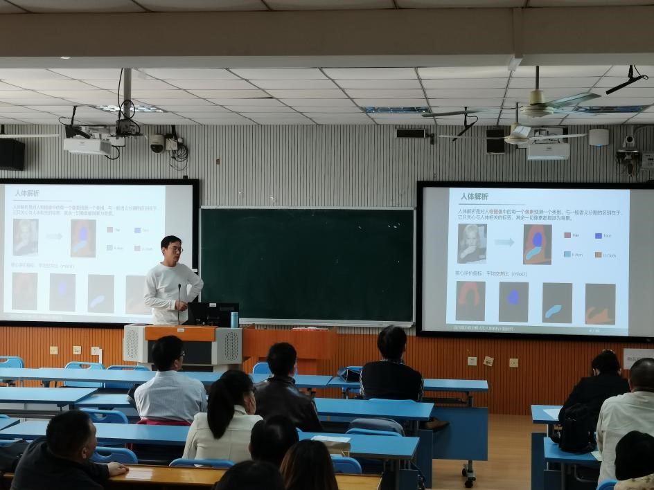 会上,何广静博士作题为《顾及拓扑关系的地形图等高线化简与尺度变换方法研究》的学术报告。何博士针对地形图等高线自动化制图中常见的拓扑冲突问题提出直线段特征描述和拓扑识别方法、基于两级BellmanFord算法的等高线自适应尺度化简方法和集成TBF与多进制小波的等高线多尺度变换方法,从而实现对等高线局部拓扑关系的细化计算和描述,并有效消除等高线化简前后的拓扑充冲突以及保持等高线在多尺度变换中对主要地形的正确表达。黄恩博博士作题为《面向复杂视觉模式的人体解析问题研究》的报告,从数据集不平衡性、先验信息融合、信号表征与处理等三个角度描述了人体解析问题中的复杂视觉模式问题,并将其转化为对应视角的科学问题。报告详细描述了不同视角下对复杂视觉模式问题的转化思路,对应模型的特点及应用场景以及人体解析模型的应用价值。会后,各位教师与两位博士就相关问题做了深入地探讨,相互交流了学习体会。
