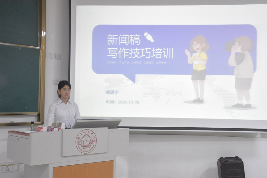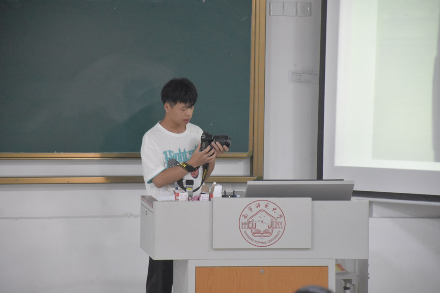 活动伊始,教育技术协会影像部部长闭应启同学介绍相机各功能的作用、参数的调整方法以及如何寻找光线、拍摄角度,指导同学们如何在实践中提升自己的拍摄能力。接着宣传部工作人员赖思宇介绍新闻稿的写作要素、格式布局、字体等要求,并运用实例来形象指导同学们如何规范地完成一篇新闻稿。