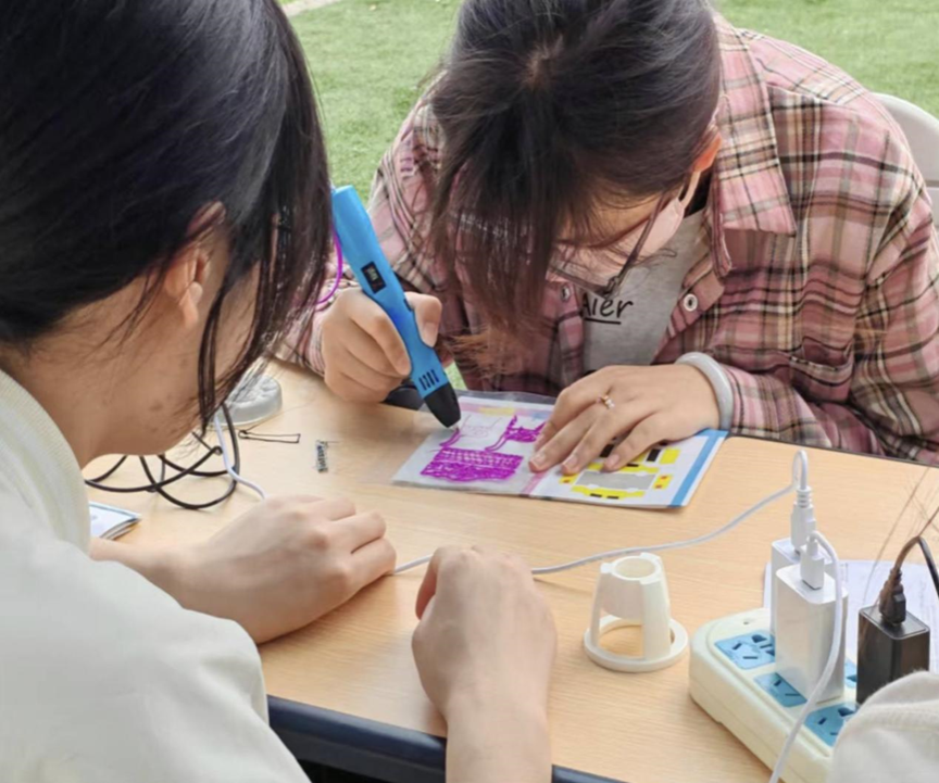 本次活动主要展示3D打印机、教育机器人及无人机等,其中最吸引师生的是具有多模态交互能力的教育机器人AI助教。这款集成“课堂助手+学习伙伴+教学资源平台”功能的智能设备通过生成式AI大模型精准解析知识要点,与教师形成教学协同,实时根据学生专注度数据优化辅导策略。志愿者们演示了自然语言对话、英语启蒙互动和双师教学模式,吸引了师生驻足观看。同时,师生们还体验了用3D打印笔绘制图案,了解无人机飞行控制原理。