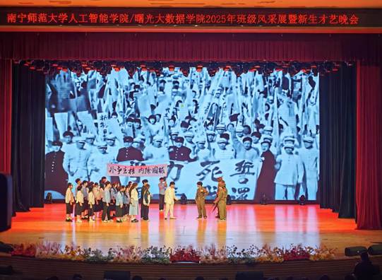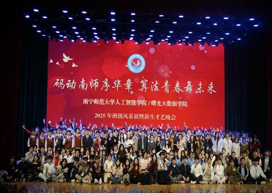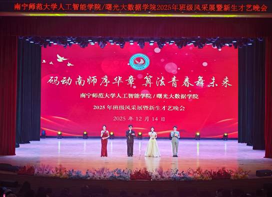 在武鸣校区千人演播厅举办“码动南师序华章,算法青春舞未来”2025年班级风采展暨新生才艺晚会。学院党委副书记(主持党委工作)黄江涛、党委副书记韦柳温、曙光锐翼合作中心项目经理姚媛老师、大数据系系主任梁烽老师、班主任代表、学院辅导员、各学院学生代表、全体新生等600余人现场观看了演出,晚会同步进行线上直播。