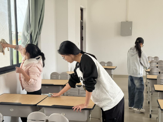 动员结束后,志愿者手持扫帚、抹布、拖把等工具前往教室清扫。大家分工协作,擦拭门窗黑板、清扫地面、整理讲台。同学们默契协作、热情高涨,用行动践行志愿精神。